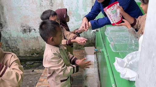 Setelah itu, mahasiswa memandu praktik cuci tangan tujuh langkah sesuai standar WHO. Siswa mengikuti setiap gerakan dengan antusias, sementara fasilitator memberikan koreksi agar teknik cuci tangan dilakukan secara tepat. Usai praktik, seluruh peserta mendapatkan snack setelah memastikan tangan mereka telah bersih.